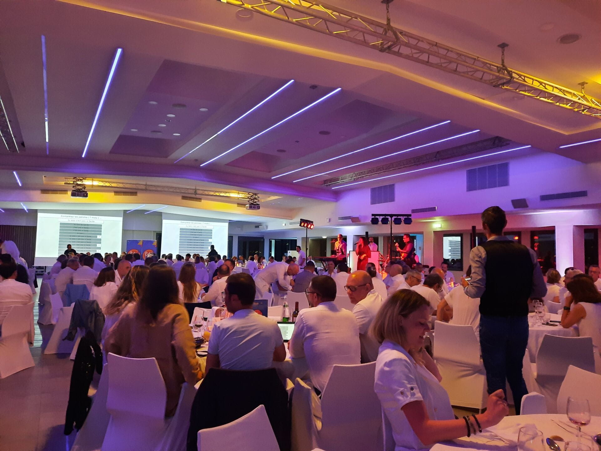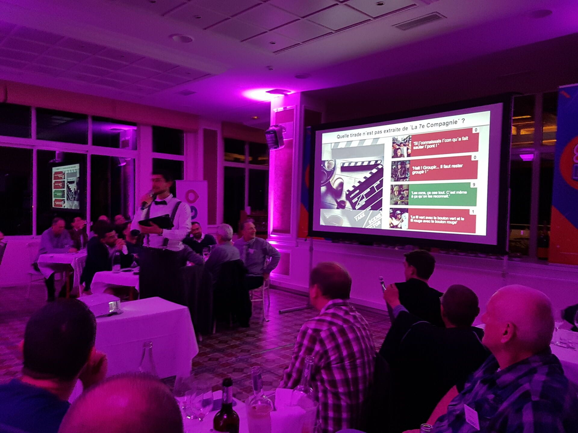 Une animation de dîner d’entreprise clé en main combinant quiz interactif, blind test musical et classement en temps réel pour dynamiser votre soirée professionnelle et engager jusqu’à 300 participants.